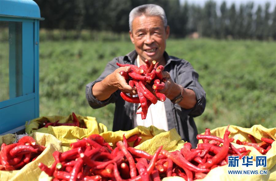 9月16日,阜城縣王集鄉(xiāng)南張莊村農(nóng)民在展示采摘的辣椒。近年來(lái),河北省阜城縣王集鄉(xiāng)在推進(jìn)產(chǎn)業(yè)富民過(guò)程中,積極引導(dǎo)農(nóng)民調(diào)整農(nóng)業(yè)產(chǎn)業(yè)結(jié)構(gòu),按照品種特色化、種植規(guī)模化、產(chǎn)銷一體化的“公司+基地+農(nóng)戶”的經(jīng)營(yíng)模式,鼓勵(lì)農(nóng)民發(fā)展特色辣椒種植,推行“訂單種植”模式,開辟出了一條農(nóng)民創(chuàng)收新路徑。目前,阜城縣王集鄉(xiāng)辣椒種植面積3100余畝,每畝年收益2500元以上,帶動(dòng)當(dāng)?shù)剞r(nóng)民實(shí)現(xiàn)增收。新華社記者朱旭東攝