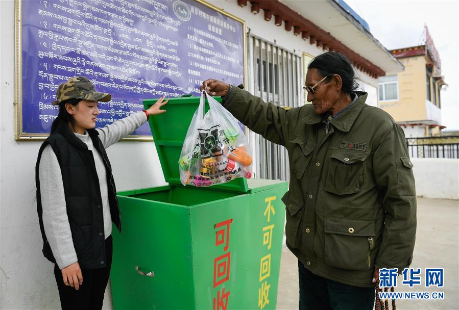 西藏阿里地區(qū)普蘭縣巴嘎鄉(xiāng)居民(右)在“垃圾銀行”兌換點(diǎn)工作人員指引下,將垃圾丟入分類箱中(9月13日攝)。 生活垃圾1袋可兌換胸牌1個,2袋可兌換鑰匙扣1個,可回收垃圾1袋可兌換抽紙1包或濕巾1袋……近日,記者在西藏阿里地區(qū)普蘭縣巴嘎鄉(xiāng)神山圣湖景區(qū)看到,一些游客領(lǐng)取環(huán)保袋在景區(qū)內(nèi)撿垃圾后,拿去兌換西藏特色紀(jì)念品。 這一切,得益于當(dāng)?shù)亻_設(shè)的“垃圾銀行”。今年6月,巴嘎鄉(xiāng)在神山圣湖景區(qū)開設(shè)“垃圾銀行”,鼓勵游客和群眾拾撿垃圾兌換獎品,破解景區(qū)垃圾收運(yùn)難題,取得良好效果。 新華社記者劉東君攝