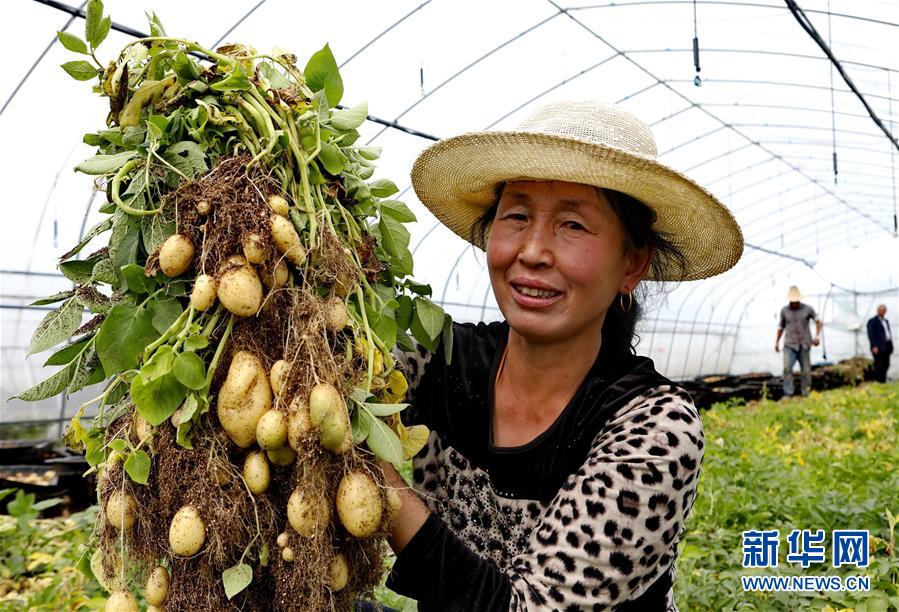9月23日,張北縣小二臺鎮(zhèn)一家馬鈴薯育種中心的工人在大棚內展示收獲的脫毒微型薯。 近年來,地處壩上地區(qū)的河北省張北縣因地制宜,積極推進馬鈴薯產(chǎn)業(yè)化發(fā)展,形成了馬鈴薯繁種育種、商品薯種植、倉儲、加工為一體的產(chǎn)業(yè)鏈,帶動農(nóng)民增收致富。 新華社記者楊世堯攝