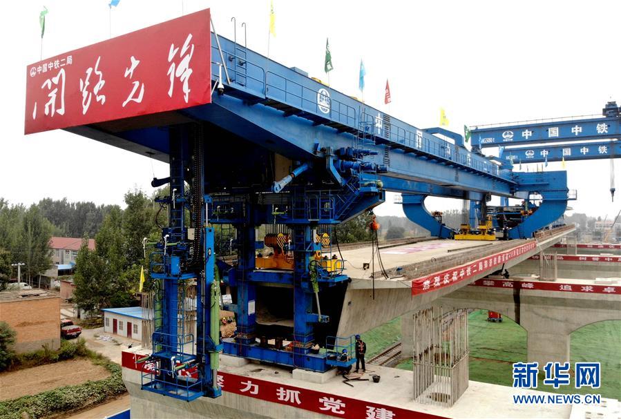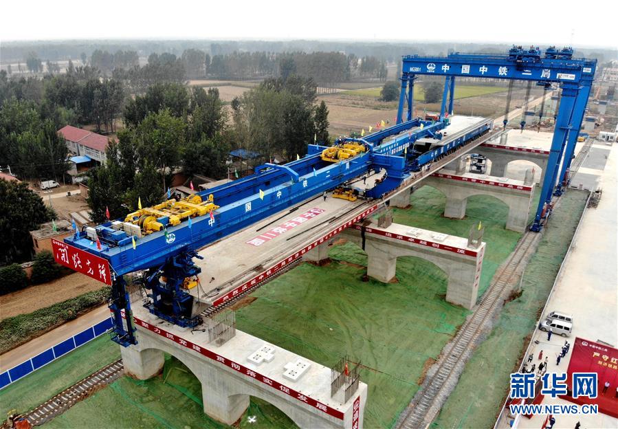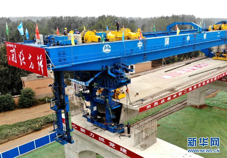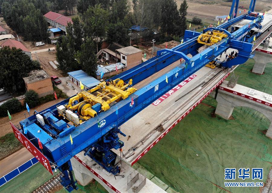 9月27日,中鐵二局的施工人員使用大型機(jī)械在鄭(州)濟(jì)(南)高速鐵路(鄭濮段)站前工程VI標(biāo)施工現(xiàn)場架設(shè)40米簡支箱梁(無人機(jī)拍攝)。 新華社記者李安攝