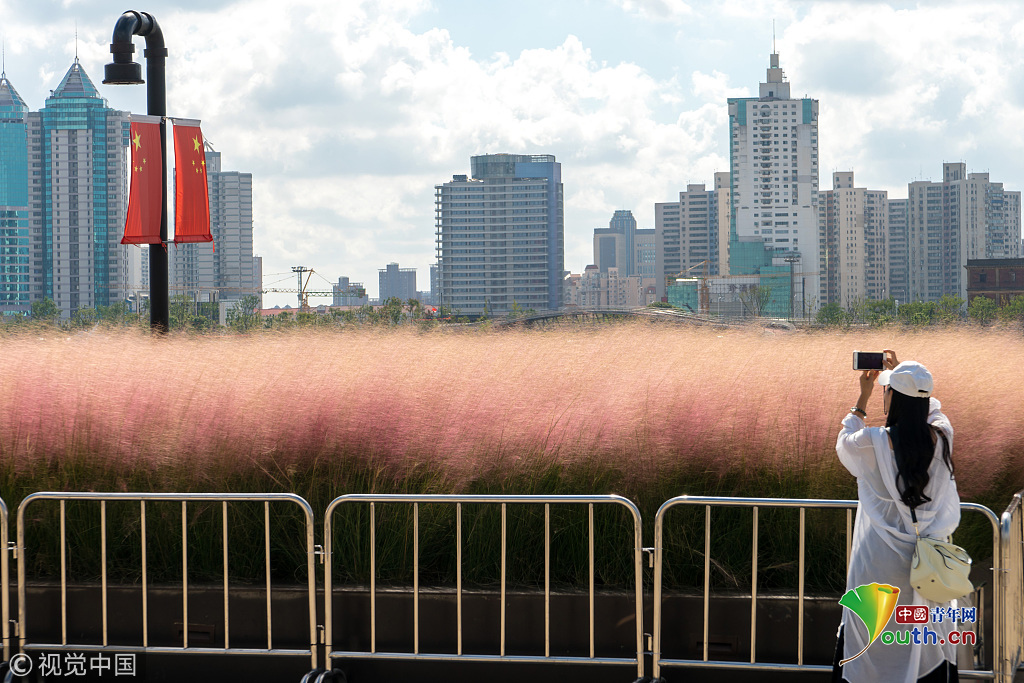 2018年9月28日,上海,東外灘楊浦濱江的粉黛亂子草目前已進(jìn)入盛花期,當(dāng)日早間,不少市民來(lái)到濱江拍照賞景,成片的紫色花海在藍(lán)天白云映襯下美不勝收。圖片作者:王岡/視覺(jué)中國(guó)