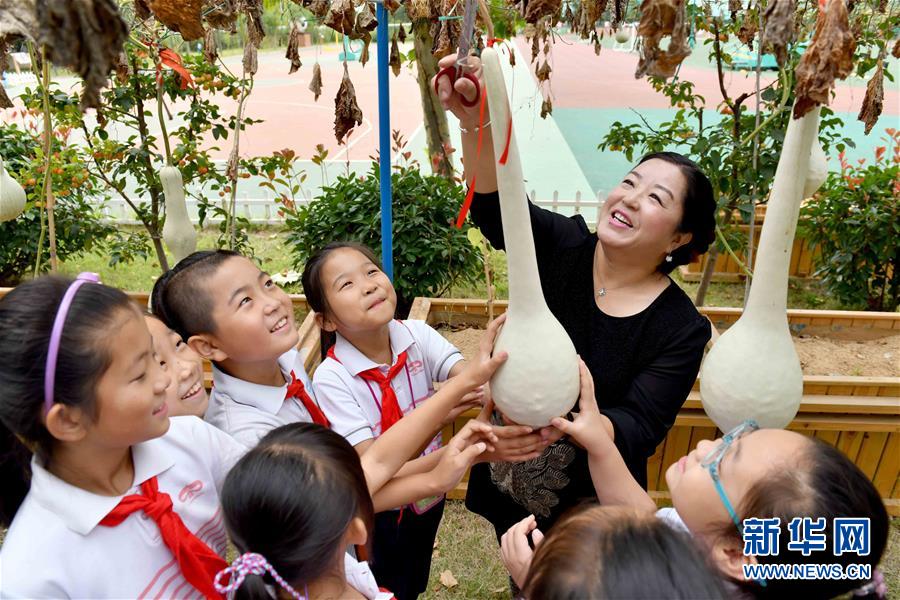 9月29日,在威海市經(jīng)濟(jì)技術(shù)開發(fā)區(qū)新都小學(xué),老師帶著學(xué)生采摘葫蘆。