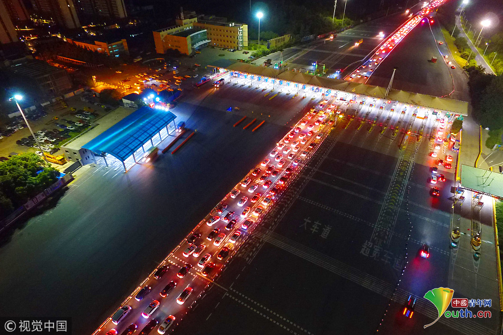 2018年10月1日,國慶假期首日凌晨1點(diǎn)左右,南京迎來出行高峰,所有高速公路出城方向迎來大批車輛,航拍南京長(zhǎng)江二橋收費(fèi)站,大量車輛排起長(zhǎng)龍,場(chǎng)面尤為壯觀。圖片作者:方東旭