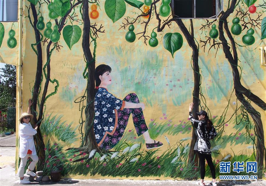 10月1日,游人在和平村的民居壁畫(huà)前留影。新華社記者任瓏攝