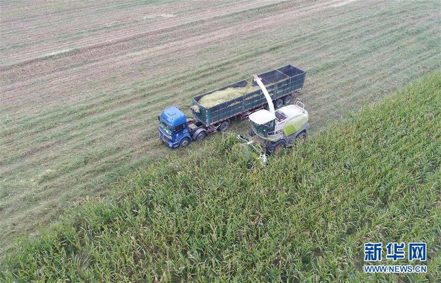 10月8日,河北故城縣里老鄉(xiāng)林場(chǎng)村農(nóng)民在收獲青貯玉米(無人機(jī)拍攝)。 近年來,河北省故城縣結(jié)合市場(chǎng)需求,通過“龍頭企業(yè)+基地+農(nóng)戶”的經(jīng)營(yíng)模式,鼓勵(lì)引導(dǎo)農(nóng)民發(fā)展訂單式青貯玉米種植,不僅增加了種植戶收入,而且為養(yǎng)殖企業(yè)提供了優(yōu)質(zhì)飼料。目前,故城縣已發(fā)展青貯玉米種植面積6萬余畝。 新華社記者 朱旭東 攝
