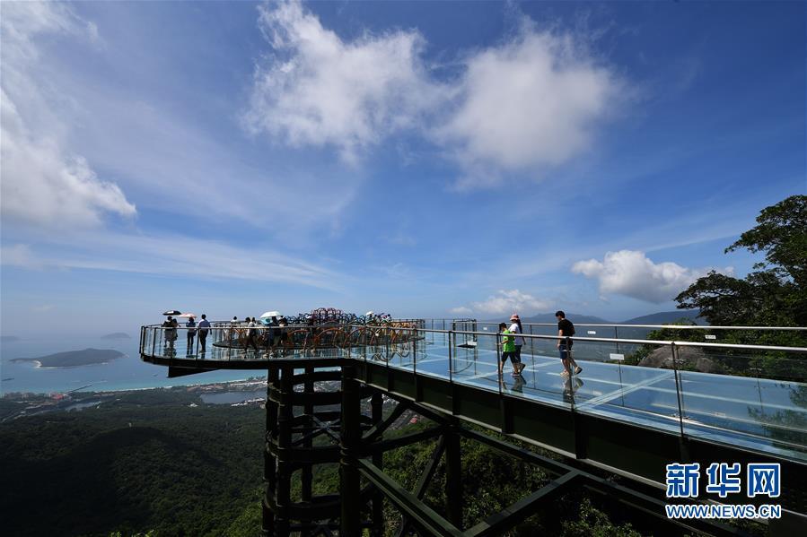 8月31日,游客在玻璃棧道上參觀游覽。近日,位于海南省三亞市亞龍灣熱帶天堂森林公園的大佛石全海景玻璃棧道開始正式營業(yè)。凌空而建的玻璃棧道全長(zhǎng)400米,游客可將亞龍灣的美景盡收眼底。新華社記者郭程攝
