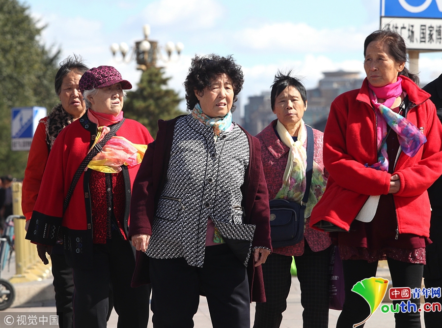 中國(guó)青年網(wǎng)北京10月10日電 2018年10月9日,北京,游客紛紛著秋冬裝游覽天安門廣場(chǎng)。當(dāng)天北京冷空氣來(lái)襲。圖片來(lái)源:視覺中國(guó)