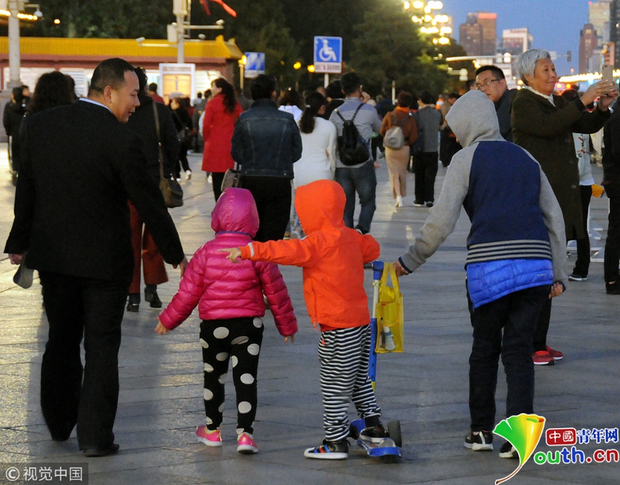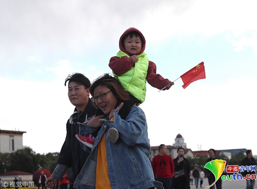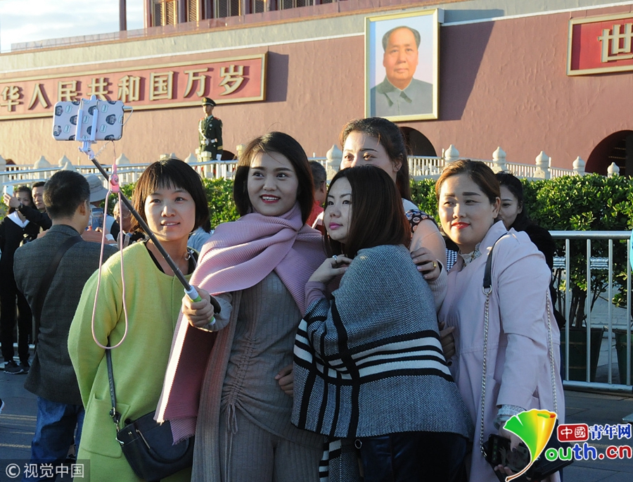 中國青年網(wǎng)北京10月10日電 2018年10月9日,北京,游客紛紛著秋冬裝游覽天安門廣場(chǎng)。當(dāng)天北京冷空氣來襲。圖片來源:視覺中國
