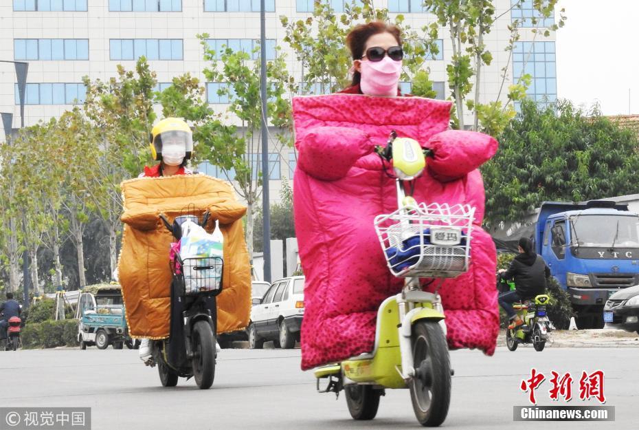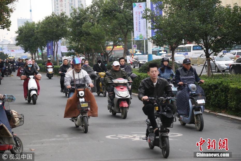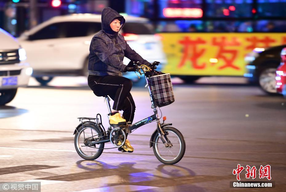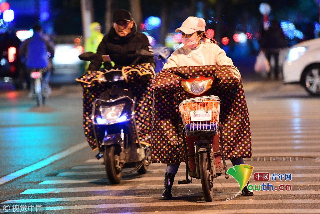 2018年10月9日,山東濟(jì)南,昨日一場(chǎng)秋雨過后開始降溫,今天清晨最低氣溫只有6度,馬路上不少上班族穿上羽絨服騎車趕上班路。 圖片來源:視覺中國