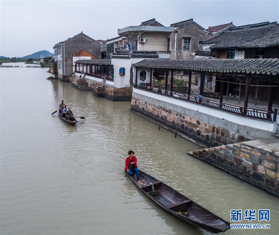 10月10日,泉家潭村村民劃著小船經(jīng)過沿河長廊(無人機(jī)拍攝)。經(jīng)過改造提升后,沿河長廊和整潔的古村街巷成為當(dāng)?shù)孛利愢l(xiāng)村的景觀帶。 新華社記者 徐昱 攝