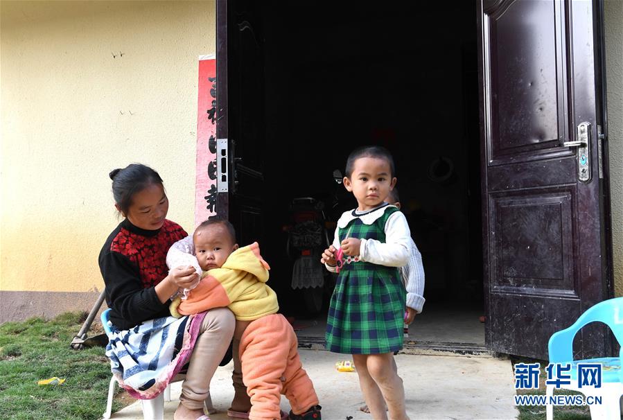 白褲瑤族同胞黎明妹在廣西南丹縣里湖瑤族鄉(xiāng)移民集中安置點的新家前照看孩子(10月11日攝)。新華社記者 周華 攝