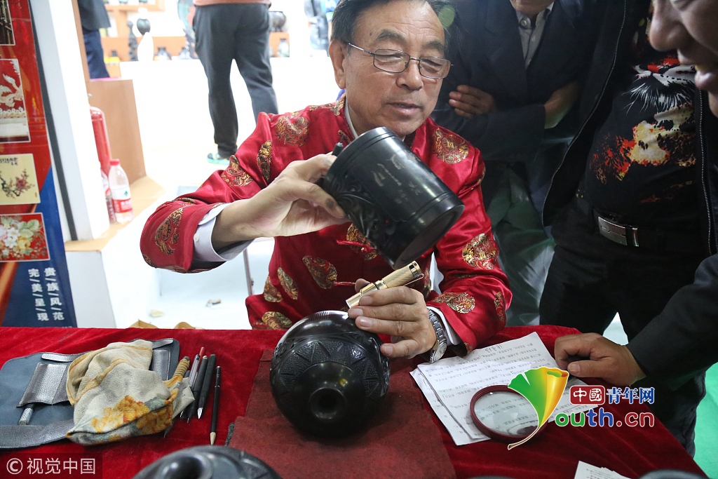 2018年10月14日,山東濟(jì)南,高新會展中心濟(jì)南文博會現(xiàn)場,張務(wù)福老先生在黑陶鼎上刻字。