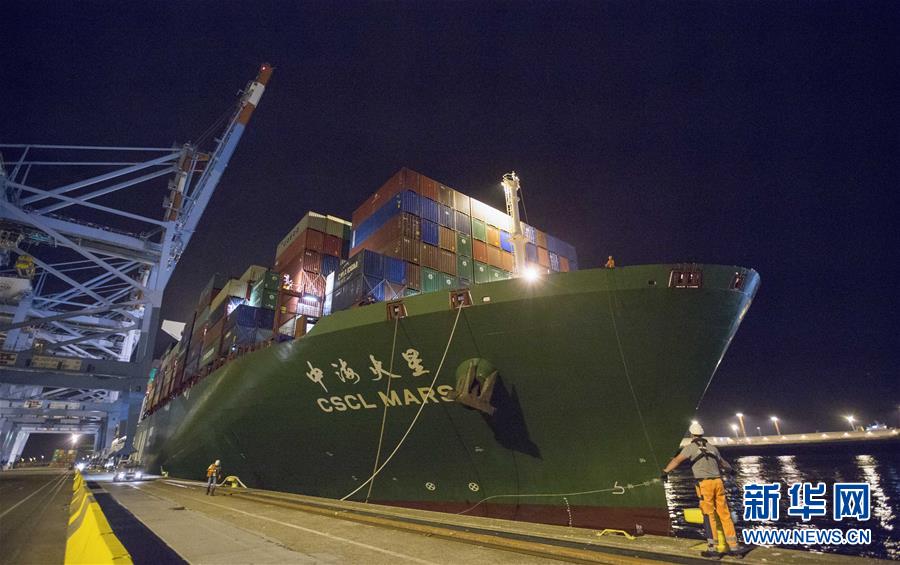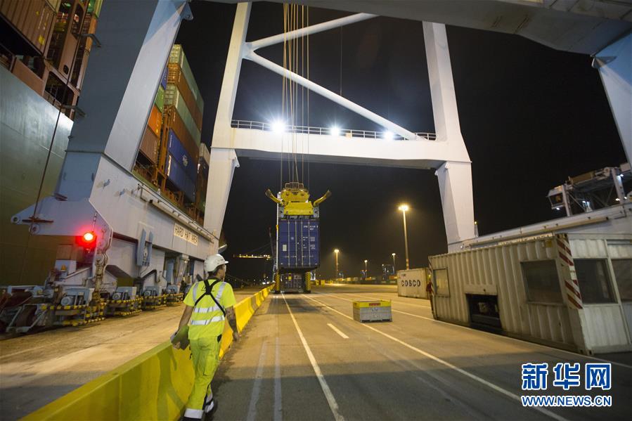 10月15日晚,中遠(yuǎn)海運(yùn)旗下的“中?;鹦恰碧柤b箱輪??吭诒壤麜r澤布呂赫港集裝箱碼頭。 新華社記者 葉平凡 攝