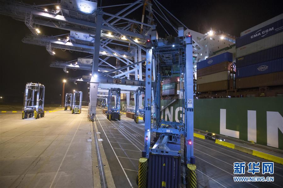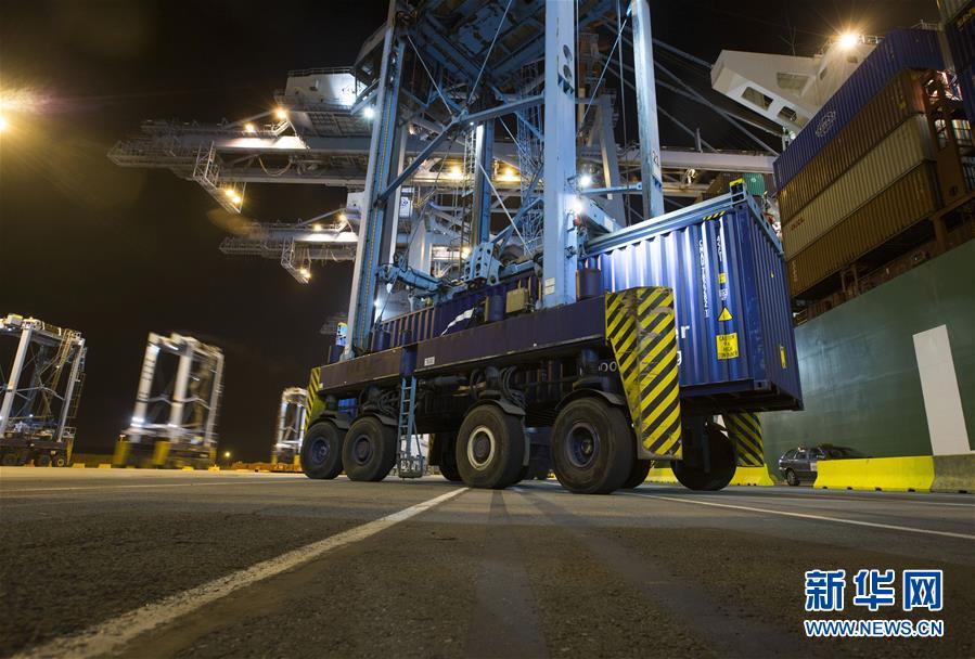 10月15日晚,在比利時澤布呂赫港集裝箱碼頭,跨運(yùn)車運(yùn)送集裝箱。 新華社記者 葉平凡 攝