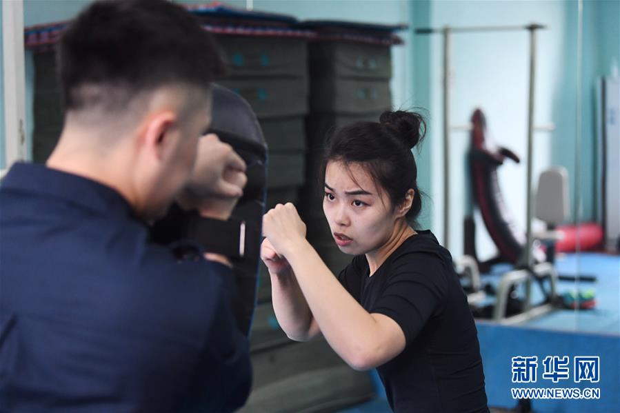 10月16日,湯春燕在健身房內(nèi)進行擒敵訓練。