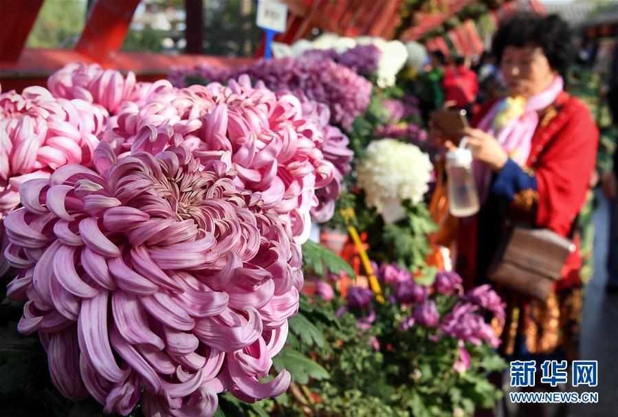 10月17日,游客在開封清明上河園觀賞菊花。重陽時(shí)節(jié),各色菊花競相綻放,把古都開封裝點(diǎn)得分外秀美,吸引眾多游客前來觀賞游玩。 新華社記者 李安 攝