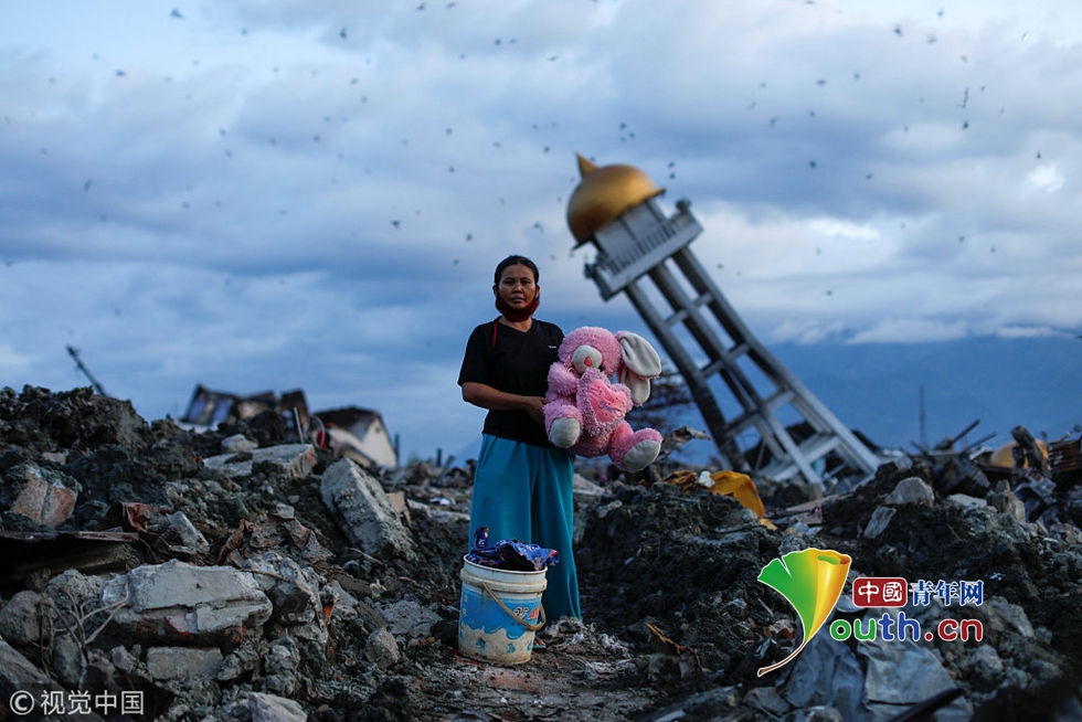 當(dāng)?shù)貢r(shí)間2018年10月7日,印尼帕盧,一名婦女在廢墟中找到了一個(gè)毛絨兔子玩具,她在地震中失去了三個(gè)孩子。圖片作者:JORGE SILVA/視覺中國