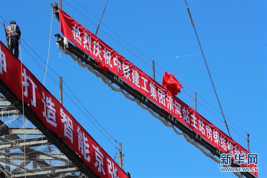 10月17日,工作人員在吊裝最后一組鋼梁。當(dāng)日,京張高鐵新建車站——清河站主體結(jié)構(gòu)正式封頂。清河站是京張高鐵建筑面積最大的車站,同時也是京張高鐵在北京地區(qū)的始發(fā)站之一。 新華社記者 張晨霖 攝