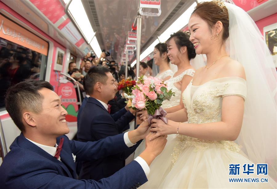 10月18日,在合肥市地鐵一號線,新人們準(zhǔn)備乘坐地鐵。當(dāng)日,中鐵四局集團(tuán)城市軌道交通工程分公司的18對新人在安徽合肥地鐵一號線的車廂里舉行了一場集體婚禮儀式。 新華社記者 郭晨 攝