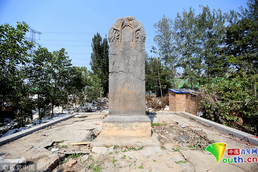 中國(guó)青年網(wǎng)北京10月21日電 近日,鄭州市惠濟(jì)區(qū)古滎鎮(zhèn)嶺軍峪村已經(jīng)因?yàn)槌鞘械陌l(fā)展被拆遷了,村民們住在安置房里等待著新房的建成,而在嶺軍峪村南約150米的田地里,有一塊在2009年文物普查時(shí)被發(fā)現(xiàn)的唐代石碑,在鄭州市發(fā)現(xiàn)唐代的碑刻是比較罕見的。 圖片來(lái)源:視覺(jué)中國(guó)