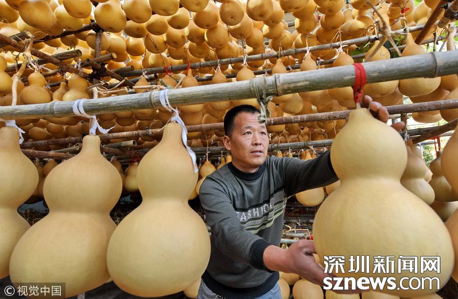 深圳新聞網(wǎng)訊  今年43歲的趙雙慧是山西省運(yùn)城市聞喜縣禮元鎮(zhèn)阜底村農(nóng)民,依托種植技術(shù)和地域優(yōu)勢(shì),積極發(fā)展葫蘆特色農(nóng)業(yè),實(shí)現(xiàn)創(chuàng)業(yè)增收。今年他種植的20多畝葫蘆喜獲豐收,成為增收的一大特色產(chǎn)業(yè)。