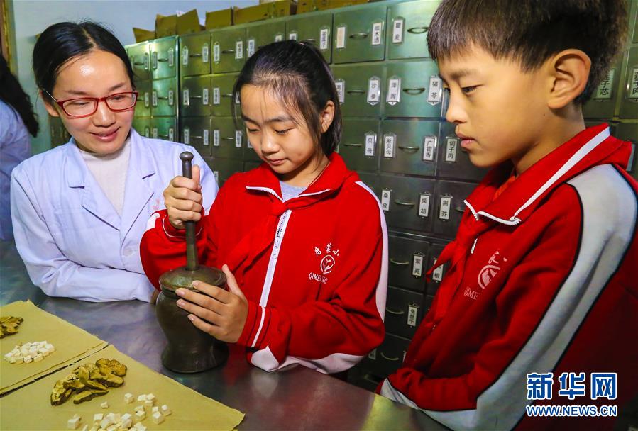 10月22日,安平縣啟蒙小學(xué)學(xué)生在安平縣中醫(yī)院醫(yī)生的指導(dǎo)下體驗用傳統(tǒng)工具加工中草藥。 當(dāng)日是世界傳統(tǒng)醫(yī)藥日,河北省安平縣啟蒙小學(xué)組織學(xué)生走進安平縣中醫(yī)院,通過參觀中藥房、認(rèn)識常見中藥、感受中藥加工等方式,向小學(xué)生普及中醫(yī)藥知識,弘揚傳統(tǒng)中醫(yī)藥文化。 新華社記者李曉果攝