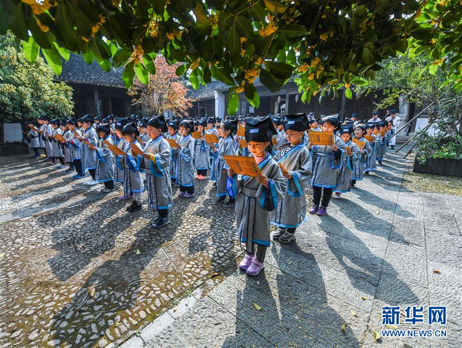 10月23日,學(xué)生們在老師的帶領(lǐng)下誦讀國學(xué)經(jīng)典。當(dāng)日,浙江省長興縣第八小學(xué)舉行“誦家規(guī)家訓(xùn),傳中華美德”校園“誠敬日”主題教育活動(dòng),通過誦讀國學(xué)經(jīng)典、講勵(lì)志故事、演美德戲劇等形式,讓學(xué)生感受優(yōu)秀傳統(tǒng)文化。近年來,該學(xué)校立足“誠敬”文化,注重國學(xué)啟蒙教育,讓學(xué)生從小培養(yǎng)“以誠立身、以敬處事”的良好品質(zhì)。新華社記者 徐昱 攝