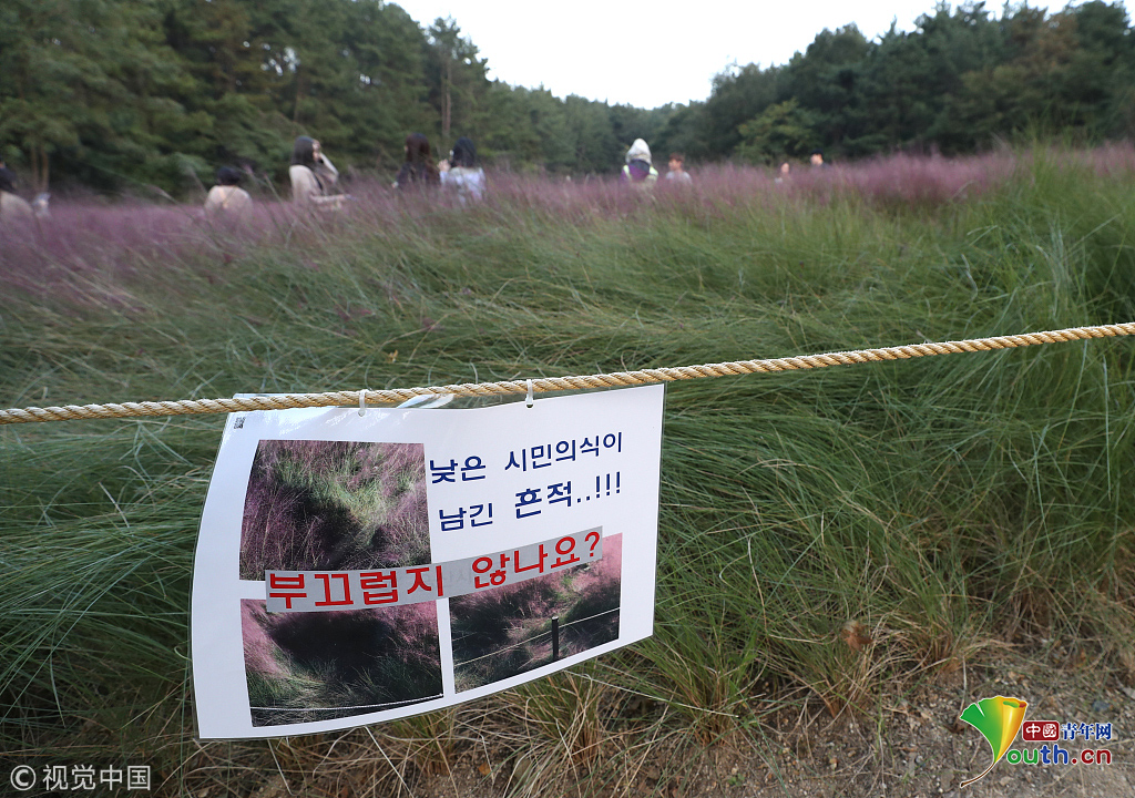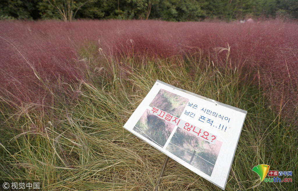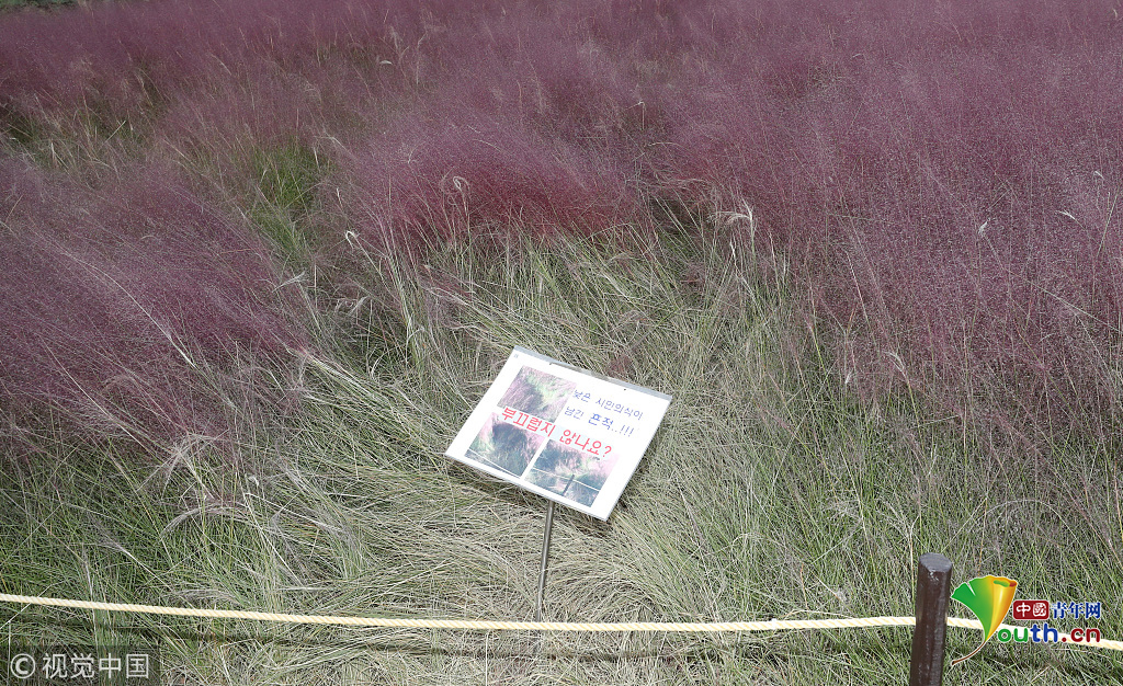 當(dāng)?shù)貢r(shí)間2018年10月16日,韓國(guó)蔚山,近日,蔚山公園大片粉黛亂子草盛開(kāi),粉紅花海浪漫十足,但部分花海遭游客隨意踩踏。公園并沒(méi)有修復(fù)遭破壞區(qū)域,而是用繩索圍起并掛上批判性告示,呼吁游客腳下留情。圖片作者:Yonhap News Agency