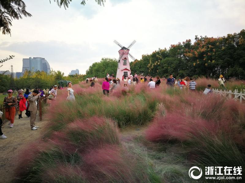 游客在生態(tài)樂(lè)園粉黛亂子草中的風(fēng)車。