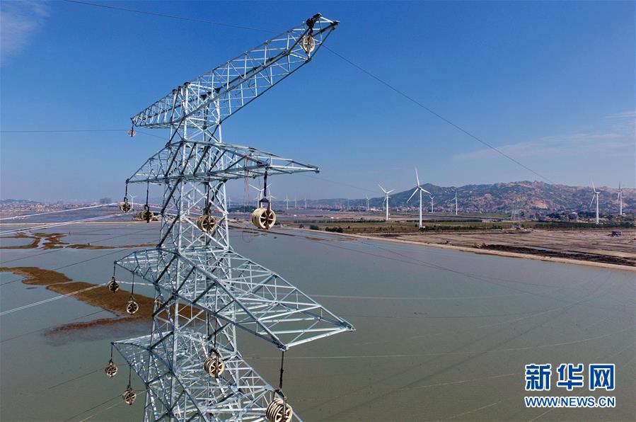 這是建在莆田平海灣上開始架線的輸送風(fēng)電鐵塔和遠處的東嶠風(fēng)力發(fā)電場(10月25日無人機拍攝)。 新華社記者林善傳攝