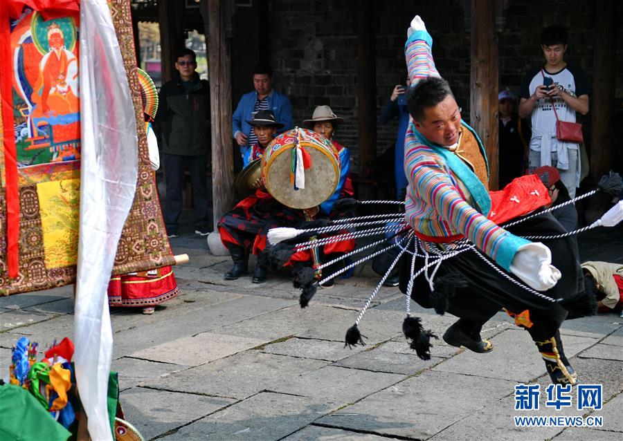 頭戴“藍”面具、身著五彩裝……附耳在一鼓一鈸中,且看這18名雪域農(nóng)牧民,在這江南水鄉(xiāng)的柔情中吟唱而舞。10月23日至28日,浙江烏鎮(zhèn)西柵景區(qū)的安渡坊碼頭廣場上,珠峰藏戲《頓月頓珠》吸引眾多游客駐足。參與演出的迥巴藏戲隊來自西藏日喀則市昂仁縣,人們在領(lǐng)略到藏戲風采的同時,也感受到了雪域農(nóng)牧民的純樸熱情。 藏戲是戴著面具、輔以唱舞敘事的藏族戲劇。內(nèi)容取材自民間故事、歷史傳說等,距今已有600多年歷史,被譽為“西藏文化的活化石”。2006年被列入國家級非物質(zhì)文化遺產(chǎn),2009年被聯(lián)合國教科文組織認定為世界級非物質(zhì)文化遺產(chǎn)。