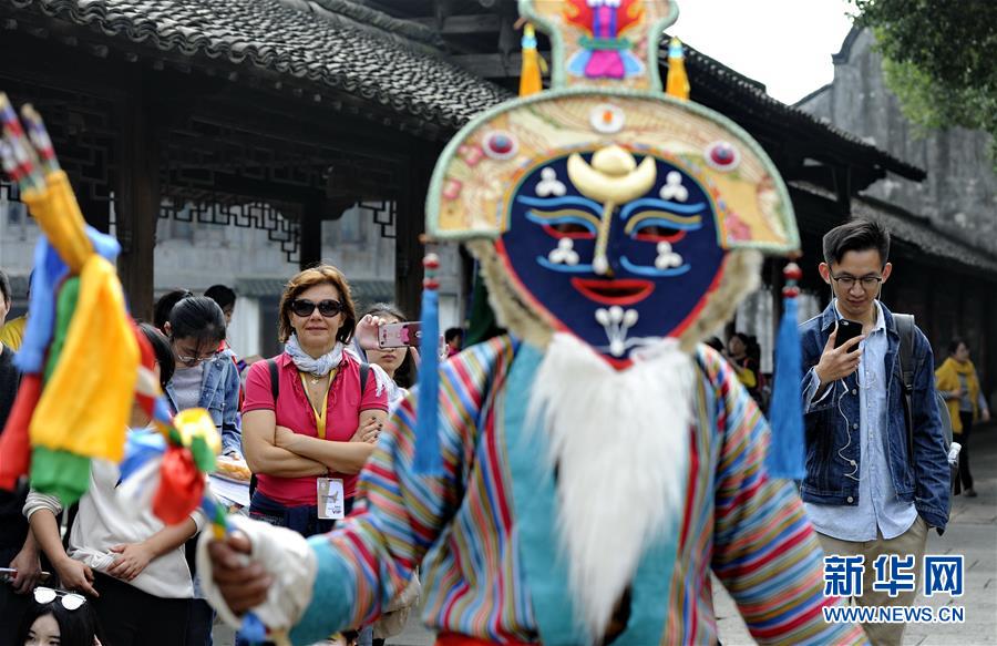 在浙江烏鎮(zhèn)西柵景區(qū)的安渡坊碼頭廣場上,觀眾觀看西藏迥巴藏戲隊的表演(10月24日攝)。新華社記者 張汝鋒 攝