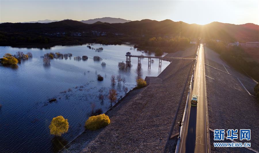 10月30日,一輛汽車行駛在北京密云水庫(kù)的大壩上(無人機(jī)拍攝)。