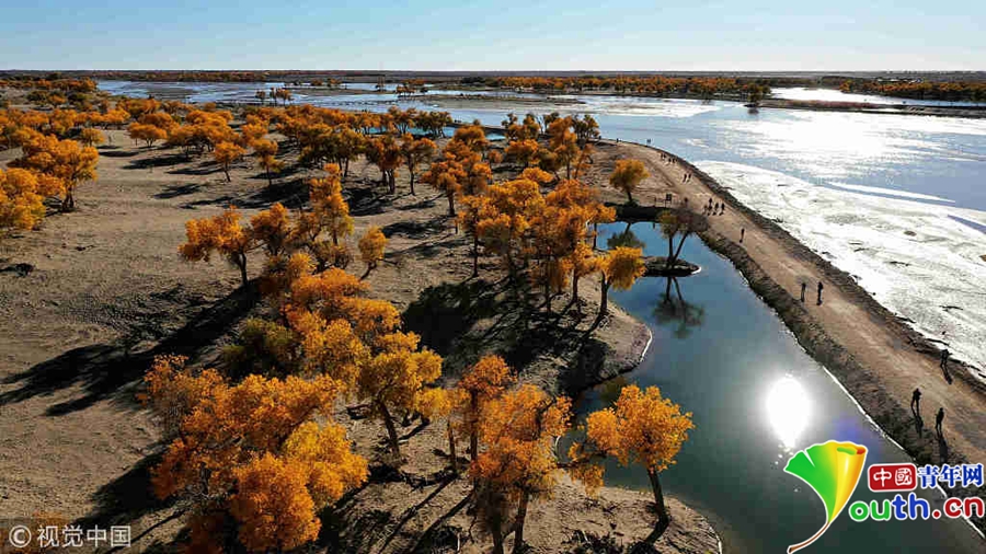 航拍內(nèi)蒙古額濟(jì)納自治旗的胡楊林。