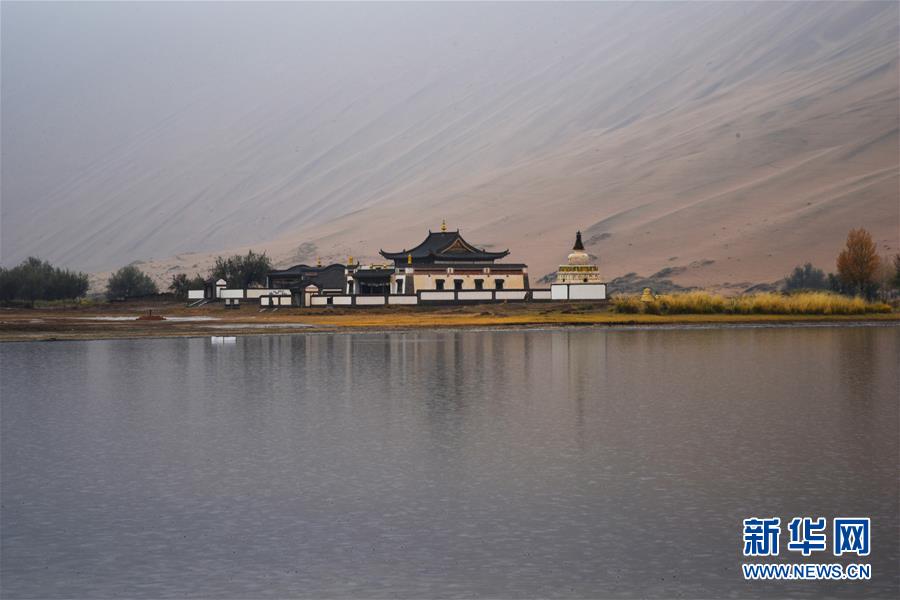巴丹吉林廟位于名為“廟海子”的湖泊旁(10月19日攝)。 巴丹吉林沙漠位于內(nèi)蒙古西部阿拉善盟,是中國第三大沙漠,沙丘起伏的曲線陡變成高聳的沙山,碧藍的湖泊散落在沙海間。 新華社記者 李仁虎 攝