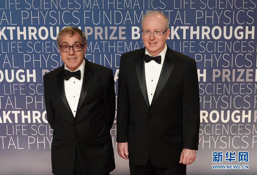 11月4日,在美國舊金山灣區(qū),獲得“基礎(chǔ)物理學(xué)突破獎(jiǎng)”的查爾斯·凱恩(右)和尤金·梅林出席紅毯儀式。 新華社記者吳曉凌攝