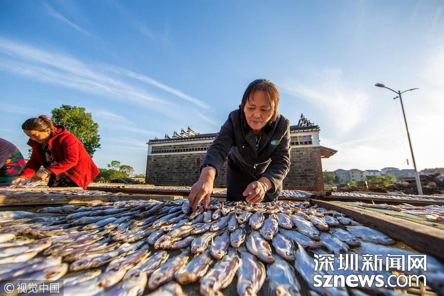 深圳新聞網(wǎng)訊 連日來(lái),秋風(fēng)颯爽,艷陽(yáng)高照,當(dāng)?shù)貪O村迎來(lái)豐收季,漁民們?cè)谯蛾?yáng)湖畔的漁港岸邊和屋前屋后晾曬魚(yú)蝦,忙的不亦樂(lè)乎。
