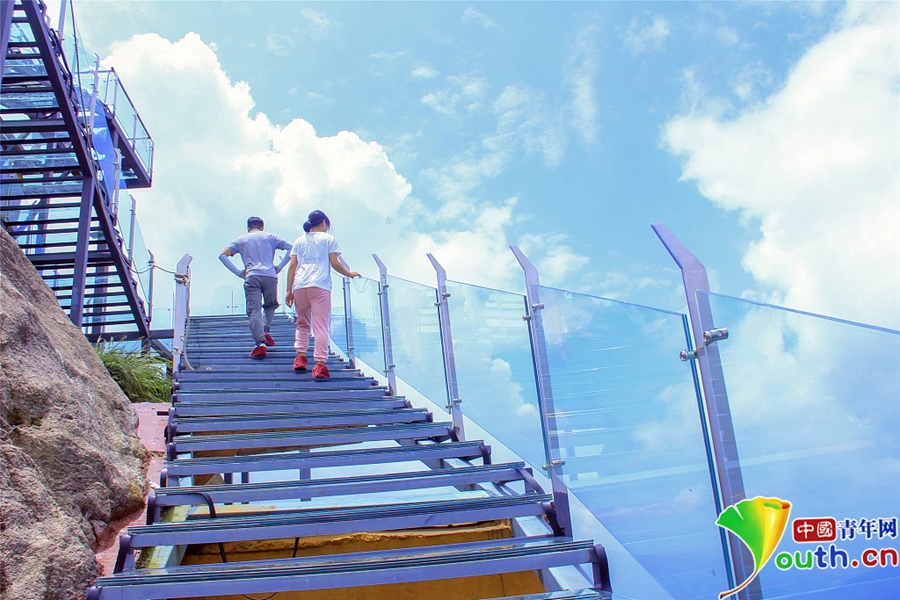 2018年8月,廣東清遠。如今,玻璃橋、玻璃觀景臺、玻璃漂流道、玻璃滑道等玻璃產品可以說多如牛毛,琳瑯滿目。這些玻璃產品都是水平的,即使有坡度,也是借助工具滑下去的。小伙伴們是否挑戰(zhàn)體驗過像樓梯一樣的玻璃天梯,階梯式攀向高處,直聳云宵,云霧飄渺。