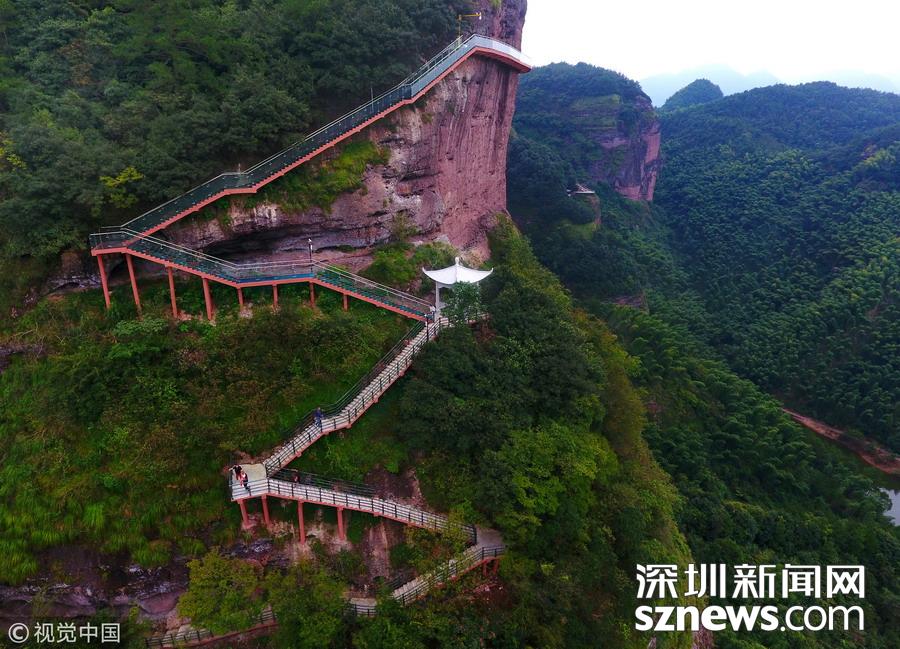 深圳新聞網訊 2018年6月19日,航拍江西贛州南武當山百米高空玻璃棧道。棧道緊貼峭壁,在懸崖之上凌空蜿蜒穿行,猶如一條玉龍盤旋在綠林石海之中。 南武當山位于江西最南端的龍南縣武當鎮(zhèn)境內,景區(qū)核心面積達到13.5平方公里,擁有99座千姿百態(tài)的巍峨石峰,丹霞地質風貌突出,連綿十里,被稱為“武當十里畫廊”。