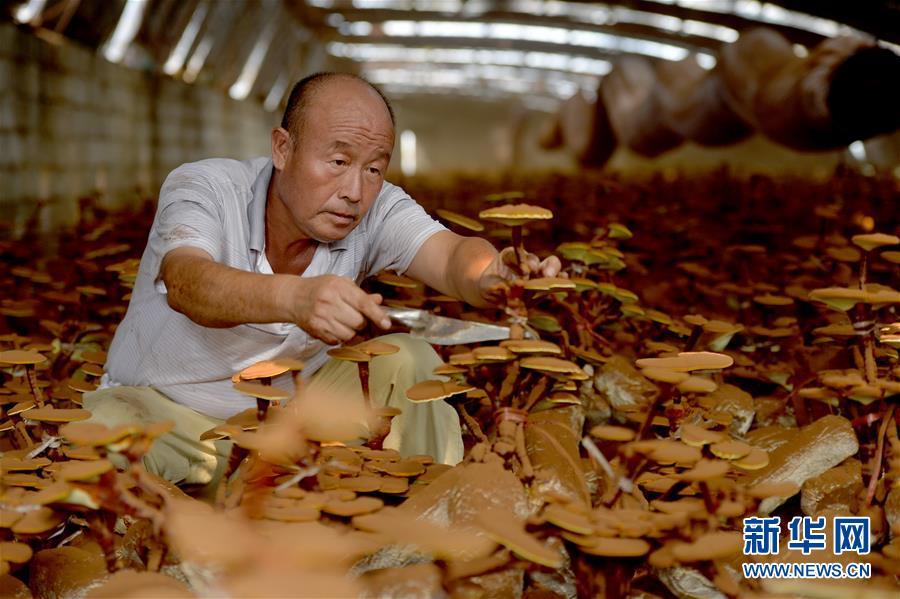 8月22日,河北省沙河市蟬房鄉(xiāng)水磨頭村農民在大棚內修剪靈芝。 新華社記者 牟宇 攝