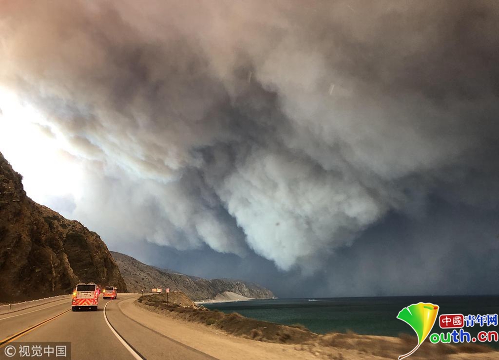 當地時間11月9日下午,美國加利福尼亞州南部文圖拉郡(Ventura County)等地熊熊山火已延燒逾萬英畝,濃煙遮天蔽日。