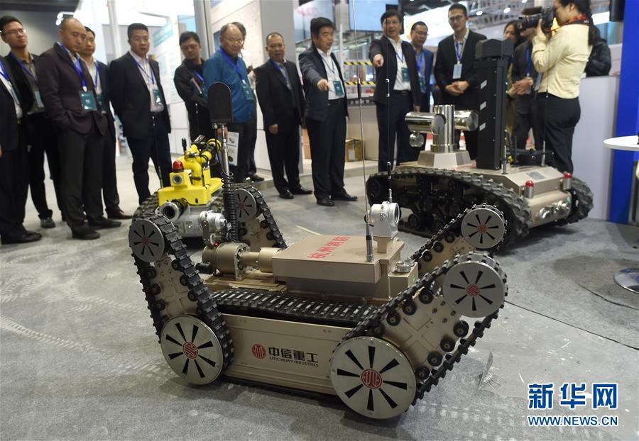 11月10日,與會嘉賓在觀看展出的消防機器人。 新華社記者韓傳號攝