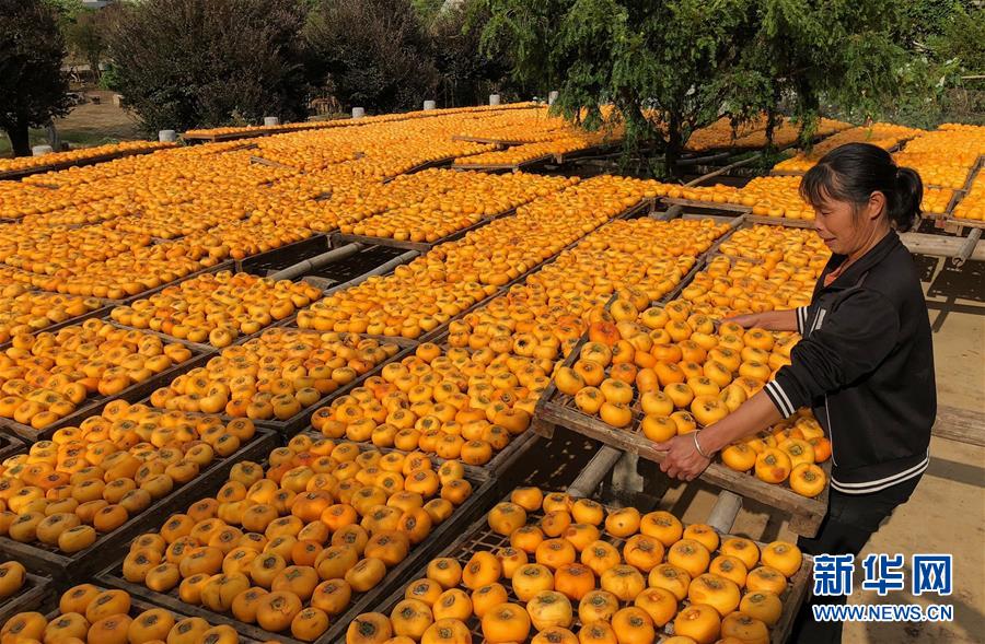 10月17日,廣西桂林市平樂縣沙子鎮(zhèn)渡河村農(nóng)民在晾曬柿子(手機(jī)拍攝)。 金秋時節(jié),農(nóng)民們忙著收獲成熟的農(nóng)作物,喜迎豐收。 新華社記者 黃孝邦 攝