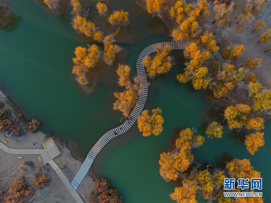 這是在內(nèi)蒙古自治區(qū)額濟納旗拍攝的胡楊林(10月10日無人機拍攝)。 金秋時節(jié),內(nèi)蒙古自治區(qū)額濟納旗胡楊林如同披上金裝,成為大漠中的一抹亮色,吸引眾多中外游客前來觀賞游玩。 新華社記者劉磊攝