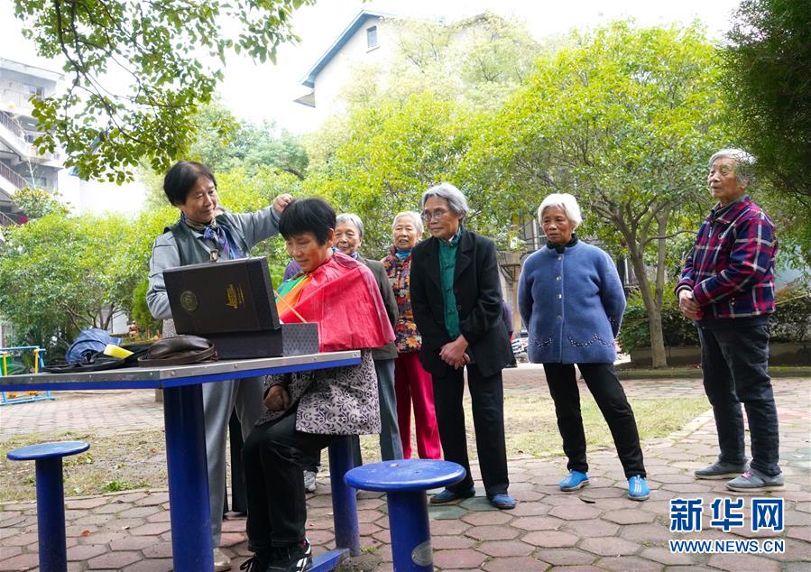11月13日,鄒勤敏(前左)在為社區(qū)居民理發(fā)。