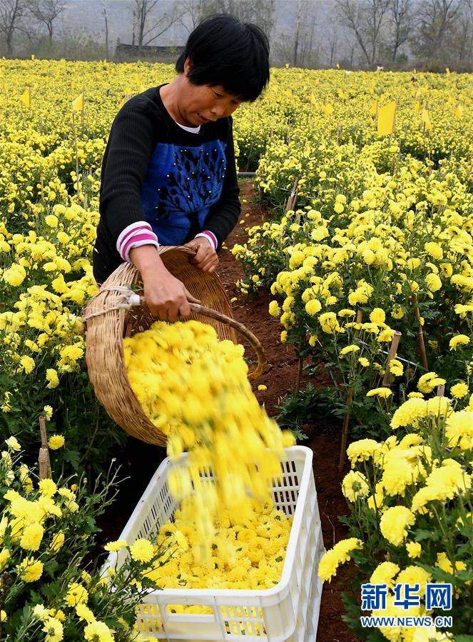 11月14日,在河南省內(nèi)鄉(xiāng)縣乍曲鎮(zhèn)水溝村千畝酈邑貢菊基地,農(nóng)戶將采摘的菊花裝筐。 近年來,河南省內(nèi)鄉(xiāng)縣依托資源優(yōu)勢(shì),把發(fā)展特色農(nóng)業(yè)作為精準(zhǔn)扶貧的重要舉措,采取“公司+合作社+農(nóng)戶”的方式,招引農(nóng)業(yè)龍頭企業(yè)發(fā)展菊花種植產(chǎn)業(yè),把菊花加工成茶飲、藥材等高附加值產(chǎn)品,累計(jì)帶動(dòng)150余戶貧困戶就業(yè)增收。 新華社記者 李安 攝
