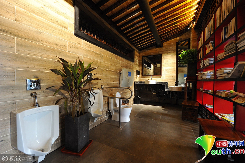 繞過“龍司”外的游廊,迎面是寬敞的古建筑廳堂,擺放中式桌椅,可供游人休息,周瑜、大小喬等東吳人物成為廁所男女標(biāo)志,廁所內(nèi)花木環(huán)繞,清新淡雅,巧妙的通風(fēng)設(shè)計讓人聞不到一絲異味。最有特色的是,詩詞書畫、特色工藝品等都進(jìn)入了這個特殊空間,讓游客在解決生理需求外還可以在這里閱讀休息,體驗塘里的鄉(xiāng)土文化。