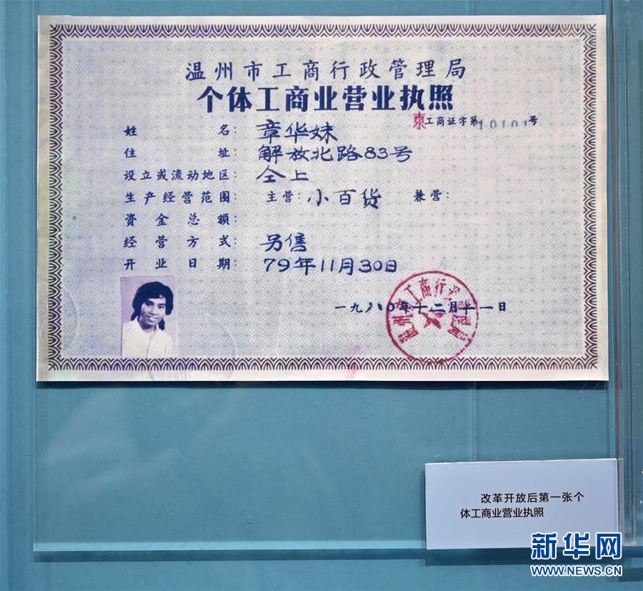 這是在“歷史巨變”展區(qū)拍攝的改革開放后第一張個體工商業(yè)營業(yè)執(zhí)照(11月15日攝)。