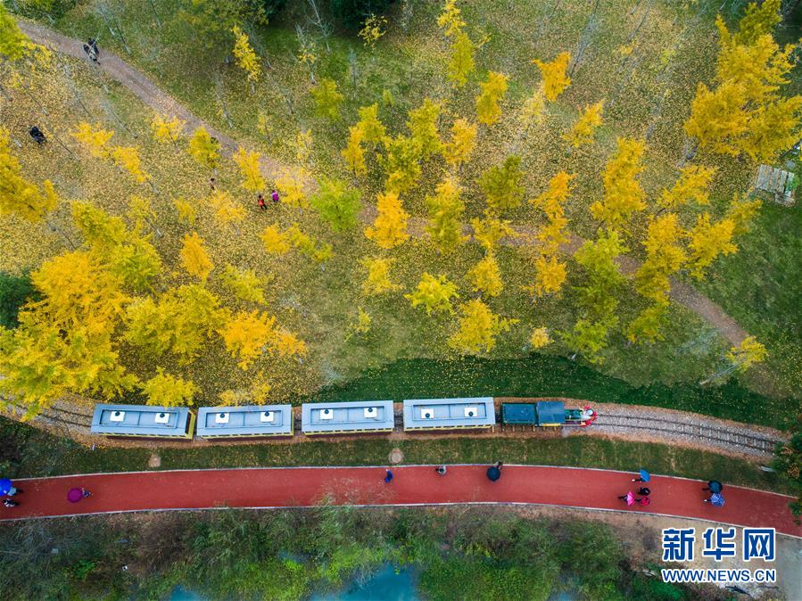 一列觀光小火車帶著游客穿行在銀杏林里(11月16日無人機拍攝)。近日,在浙江省長興縣小浦鎮(zhèn),“十里銀杏長廊”和近千畝花海經過近一年的升級改造后,以嶄新的面貌與游客見面。花海、觀光小火車、古村民宿、銀杏長廊等旅游項目全面提升了小浦鎮(zhèn)鄉(xiāng)村旅游的品質。新華社記者 徐昱 攝