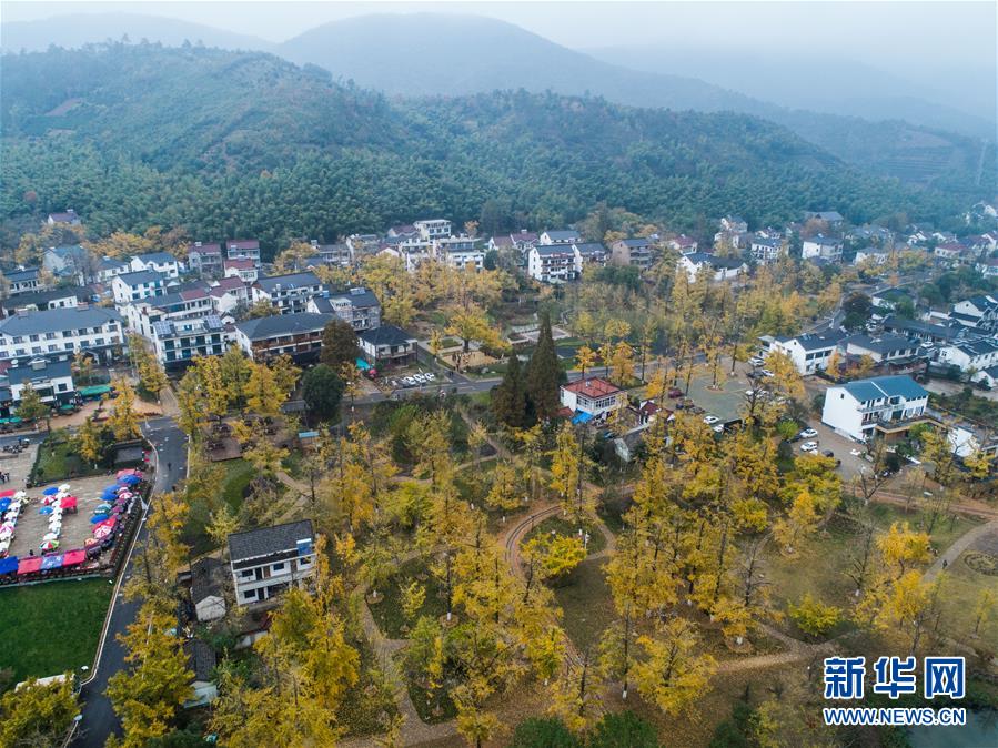 空中俯瞰十里銀杏林長廊(11月16日無人機拍攝)。近日,在浙江省長興縣小浦鎮(zhèn),“十里銀杏長廊”和近千畝花海經過近一年的升級改造后,以嶄新的面貌與游客見面?;ê?、觀光小火車、古村民宿、銀杏長廊等旅游項目全面提升了小浦鎮(zhèn)鄉(xiāng)村旅游的品質。新華社記者 徐昱 攝